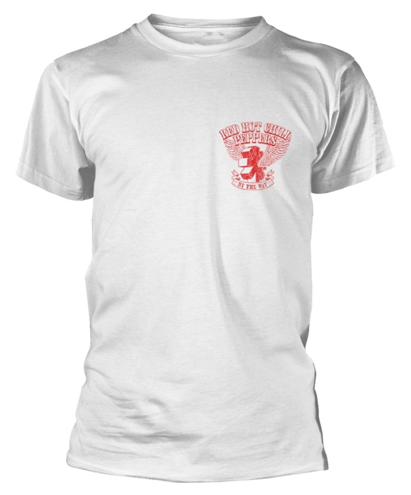 Official Red Hot Chili Peppers 'By The Way' Wings T-Shirt. White tee with small red breast pocket design on the front and large red print on the reverse.